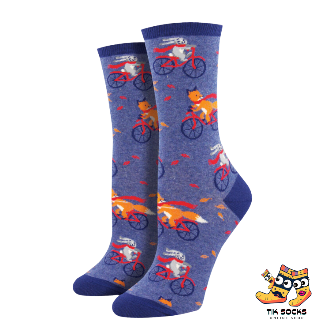 Blue socks featuring playful animals riding bikes, surrounded by falling leaves—perfect for a fun and cozy look