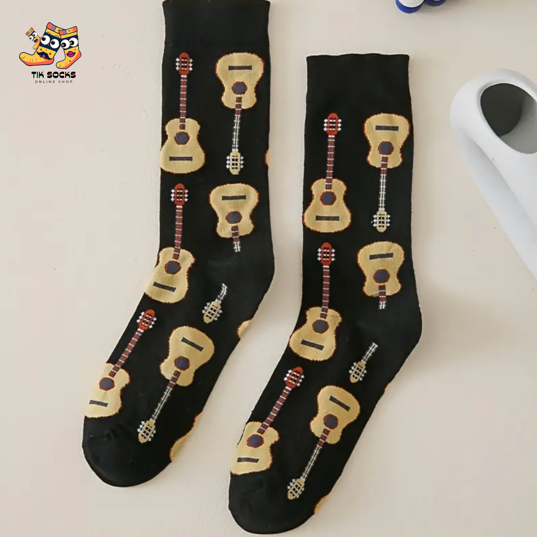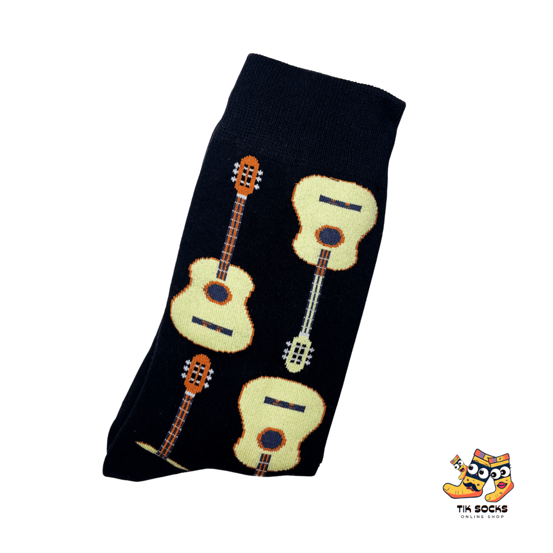 Rock your sock collection with our Black Socks featuring a Guitar Cartoon Image, a harmonious blend for enthusiasts of 'cool socks' and 'funny socks for men'. These socks strike a chord with their eye-catching design, showcasing a whimsical guitar cartoon on a sleek black background. Perfect for musicians and music lovers alike, these socks offer a fun, stylish way to show off your love for music