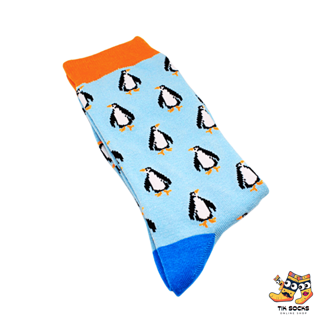 π§ Playful Penguin Pattern: The socks are sprinkled with adorable penguin figures set against a soft sky-blue background, with each penguin seemingly in mid-waddle, bringing a dynamic sense of movement and fun to your footwear.