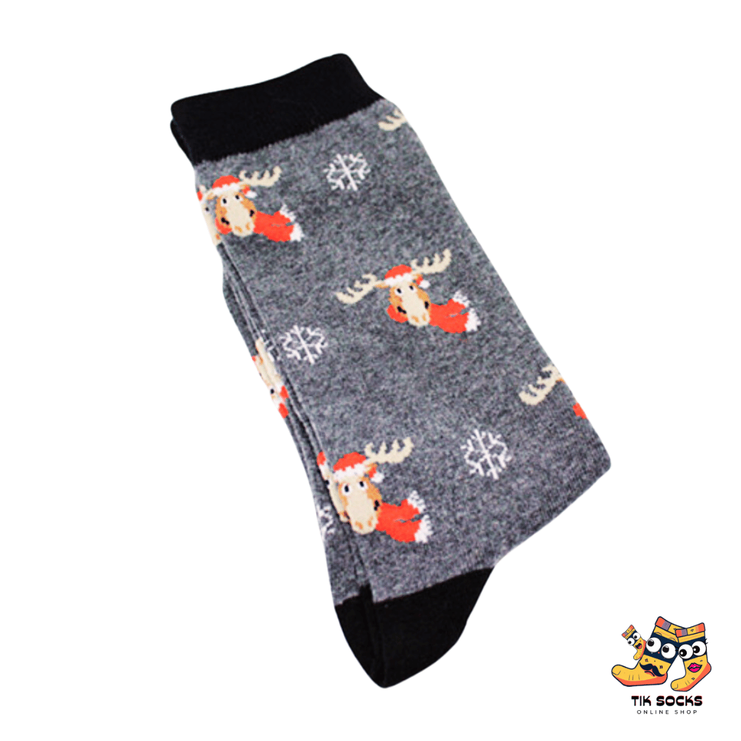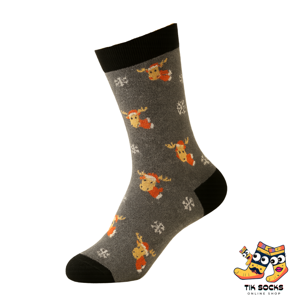🦌 Whimsical Reindeer and Snowflake Design: Adorned with the iconic image of joyful reindeer in red and white scarves, these grey socks are sprinkled with white snowflakes, capturing the essence of Christmas joy.